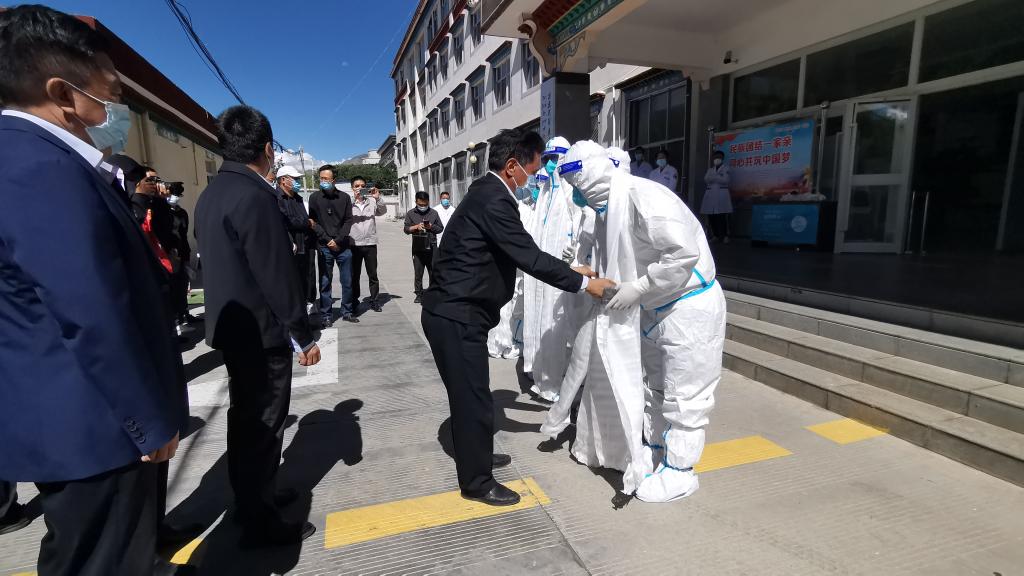 党委书记鞠明兵和校长米玛为全体队员一一敬献哈达,医疗队登车出发,全体送行人员依依挥手,同祝他们早日平安凯旋归来。