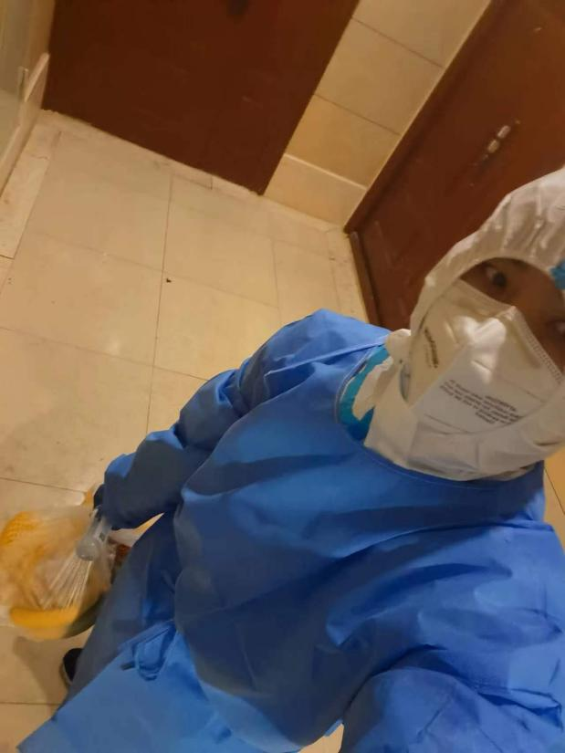 负重奔走于各楼栋各楼层,每天走家入户数十趟、行走十来公里,为封控在小区内6栋37户100余人的业主配送米面粮油、蔬菜水果等生活必需品、应急药品、日常防疫消杀品,按需分发爱心菜包、爱心药品等,是她每天的志愿服务工作。仅有的一天一身防护服到晚上撤离岗位时多处已被磨烂,疲惫的身躯回到家容不得他想便已进入梦乡,翌日一早再次穿戴密闭的行装踏上已熟悉的岗位。