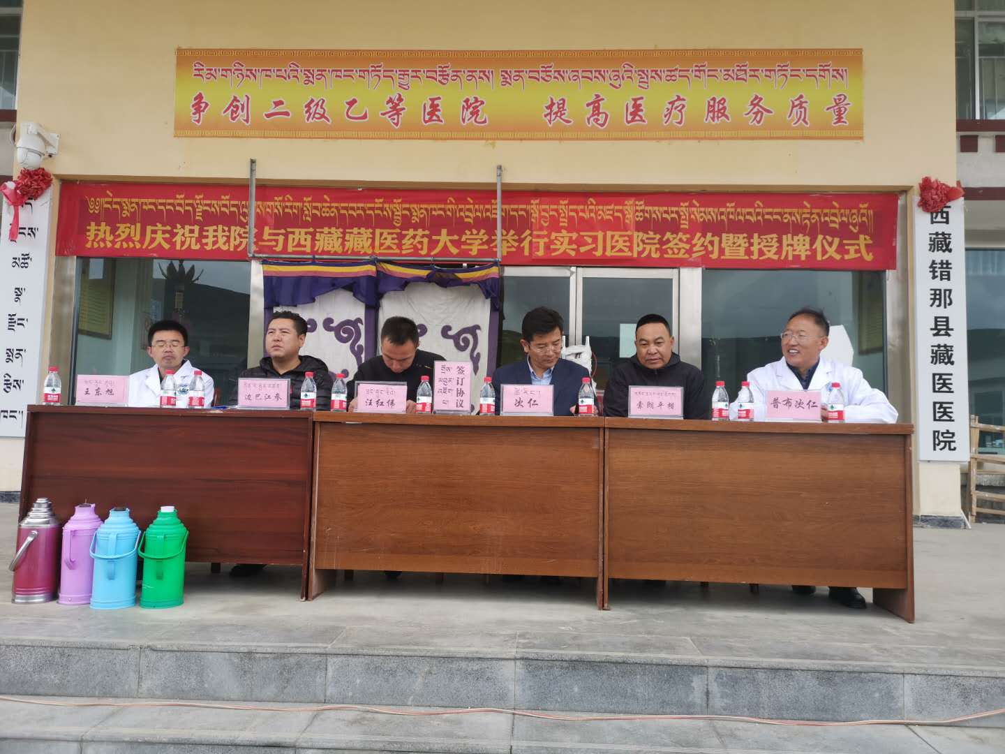 为合理解决我校以藏医、药本科为主的各专业实践教学需求,在前期调研论证的基础上,经学校领导审批,7月28日上午山南市错那县藏医院确认我校实习教学医院挂牌仪式在山南市错那县藏医院如期举行。按照会议议程,首先有山南市错那县卫生健康委员会主任汪红伟致辞,希望错那县藏医院能够牢牢把握住此次机遇,迅速提升整体办院水平,为实习学校提供良好的实习条件,营造出一个学生们愿意来、愿意留的环境;其次错那县藏医院普布次仁院长对医院发展历程和现有情况,以及对今后的发展做了汇报;最后由今年会教务处处长次仁同志代表学校介绍了学校现有的各项基本情况,充分肯定了错那县藏医院的各项工作,特别感谢医院在近些年来为我校实践教学提供的良好条件。接着举行了我校与院方实习医院签约挂牌仪式和合影留念。